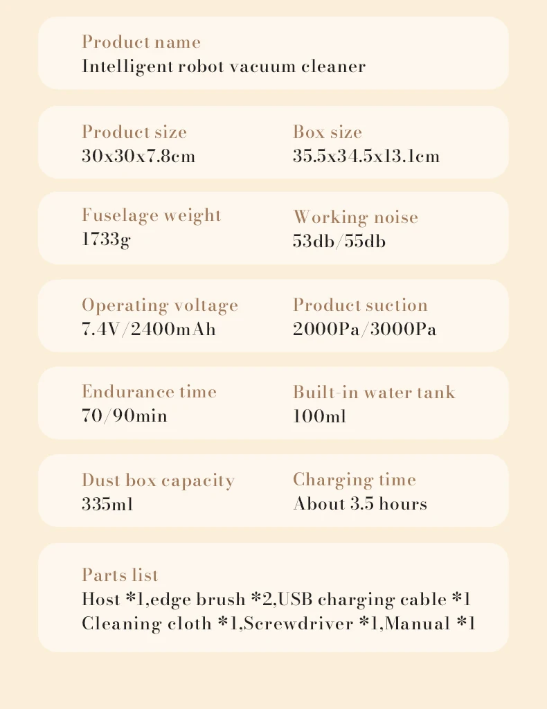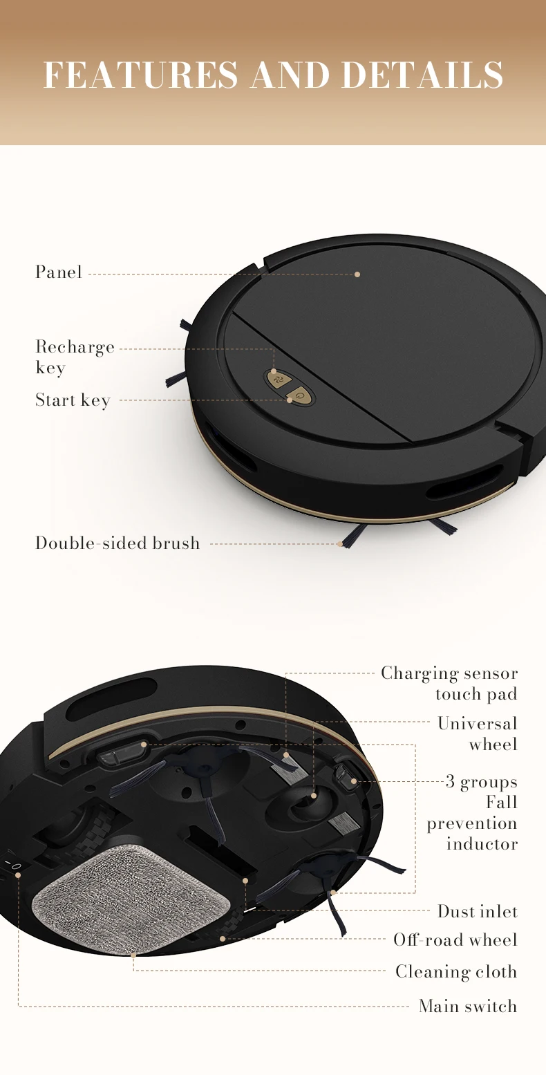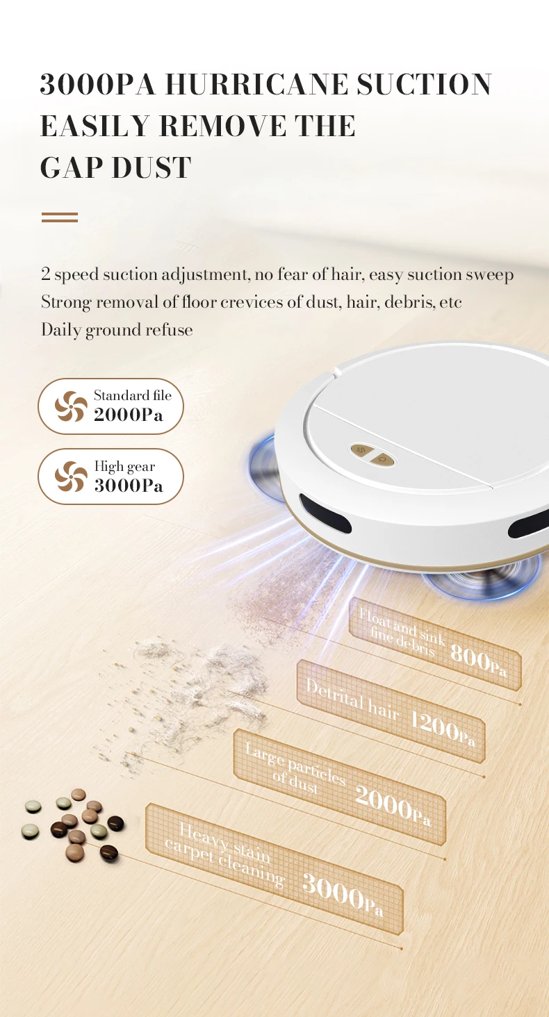 1. Versatile strength, stronger and cleaner. 3000pa high suction, one click start, multi clock cleaning mode, app intelligent control, scheduled cleaning, intelligent anti drop, Bluetooth connection, dual gray brush, 7.8cm slim body, 100ml built-in water tank, 335ml large dust box