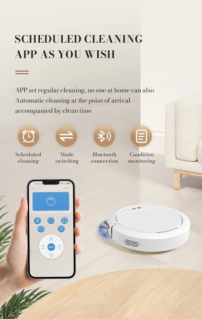 12. Schedule a scheduled cleaning appointment and operate the app at will. The APP is set to perform scheduled cleaning, allowing for automatic cleaning even when no one is at home, ensuring constant cleanliness. Appointment cleaning, mode switching, Bluetooth connection, status monitoring