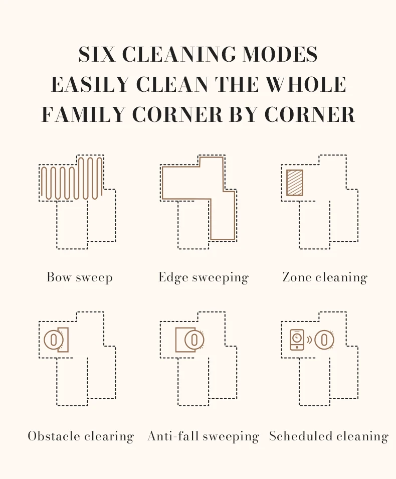 10. Six cleaning modes, easy to clean every corner of the family. Bow cleaning, edge cleaning, area cleaning, obstacle crossing cleaning, anti fall cleaning, scheduled cleaning